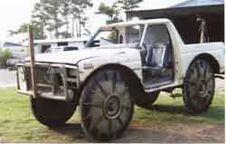 He had a local machine shop make the wheels, which mount on the Bronco's original wheel hubs. The wheels are equipped with metal ribs on both sides, which provides traction in deep mud. In addition, a piece of rebar is welded to the outer edge of each wheel in a wavy, zig zag pattern to improve their grip.