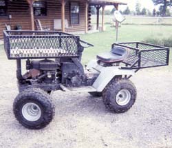 "I came up with the idea because I didn't want to spend the money for a new 4-wheeler. It isn't as fancy as commercial ATV's, but it does everything they do. I can shift it on-the-go at speeds up to 45 mph," says Hatton. "I wasn't using the mower any more so I figured why not convert it into an ATV? It was a relatively simple thing to do. I geared the transmission up and modified the steering system."