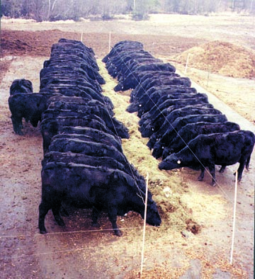 "Finally we thought of this idea and I can't imagine a better way to feed cattle. The idea consists simply of two electric lines spaced about 4 ft. apart and positioned 3 1/2 ft. high. We dump feed in the middle. If cattle start pushing the feed around, it just gets pushed over to the cow on the other side. So there's virtually no waste.