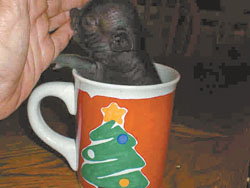 At birth, tiny teacup pigs weigh just 9 oz. and easily fit inside a small cup. The little porkers were bred down from potbelly and other small domestic breeds.