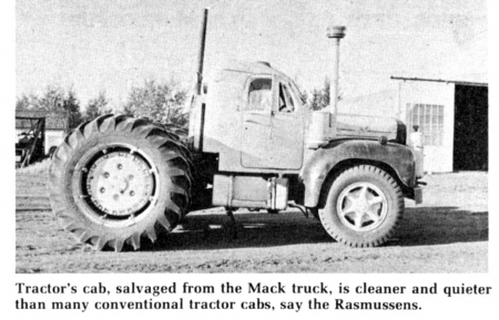 Big tractors cost lots of money, unless you build your own like G. R. Rasmussen and his son, Brian, did in the workshop on their farm near Standard, Alberta, Canada. Their homemade 135 hp tractor started as a Mack truck and the rear end from a Euclid machine found in a scrap yard. It took one winter  to put the tractor together. "We've been using it for ten years and it's still going strong," says Brian.