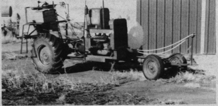 "I came up with the idea because I wanted a self-propelled sprayer and the old combine wasn't being used. I removed nearly all the tinwork and everything that had to do with threshing crops. I mounted a 300 gal. tank on the frame and used a roller type pump. The 9-in. pulley that runs the pump mounts on a shaft that once powered the combine cylinder. I mounted a 12-in. pulley on the pump itself. A boom fitted with jet spray nozzles is mounted on rear and all controls are mounted next to the tractor seat. The sprayer is also equipped with a hand-held spray gun with 50 ft. of hose attached for spot spraying fence rows, and also to spray cattle."